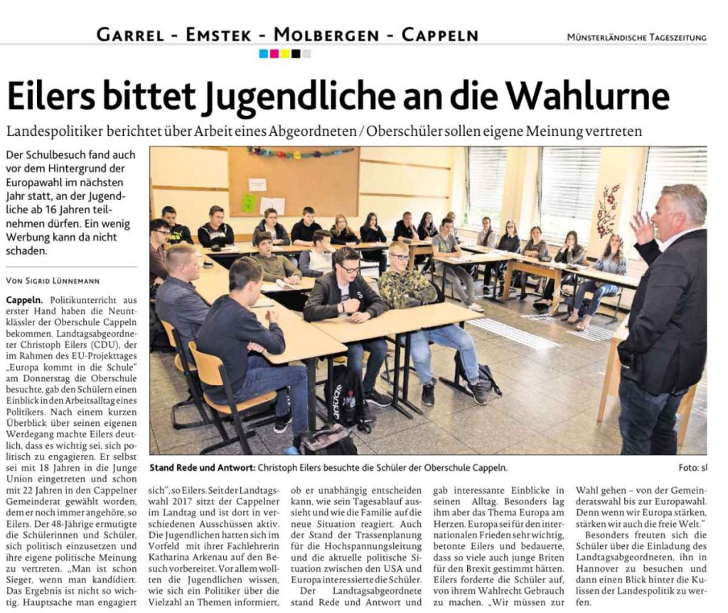 Im Zuge des EU-Projekttages 2018 besuchte der Landtagsabgeordnete Christoph Eilers die Neuntklässler unserer Schule. Er berichtete von seiner Arbeit als Abgeordneter in Hannover und warb für ein politisches Engagement der jungen Menschen. Wichtig sei es, sich mit seiner Stimme an den Wahlen zu beteiligen.