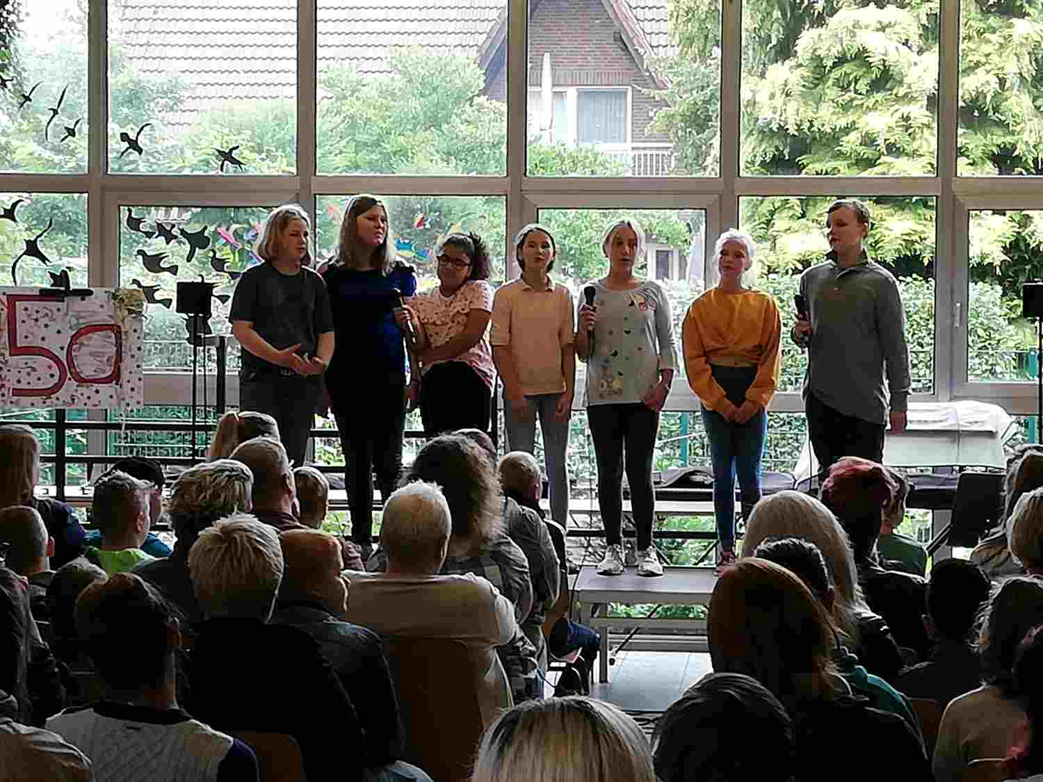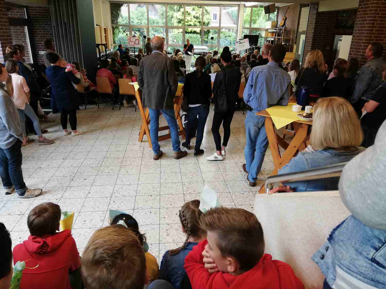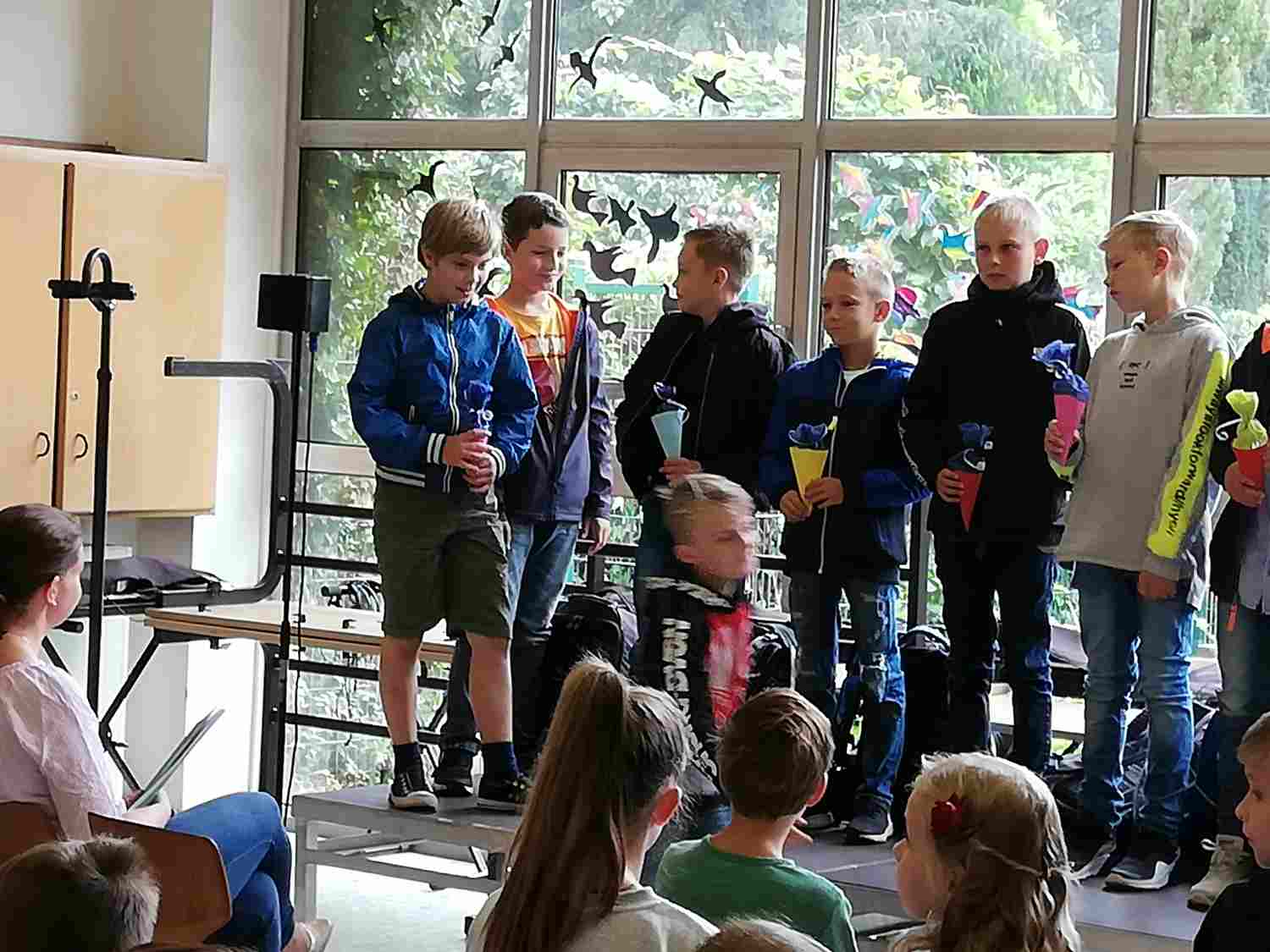 Am Donnerstag, den 15. August 2019, wurden um 10.00 Uhr die 52 Schülerinnen und Schüler der 5. Klassen durch die Schulleiterin Petra Brokamp willkommen geheißen. Eingeladen waren auch die Eltern der Kinder, die zahlreich erschienen sind. Die Einschulungsfeier wurde maßgeblich von den Schülerinnen und Schülern der Chor- und Sketch- AG unter der Leitung von Frau Nicole Dockmann durch eine humorvolle Musicalaufführung gestaltet. Die Klassen 6a und 6b und ihre Klassenlehrerinnen Frau Meike Meyenburg und Frau Sandra Luttikhuis begrüßten die „Neuen“ mit einem kleinen Willkommenspräsent.