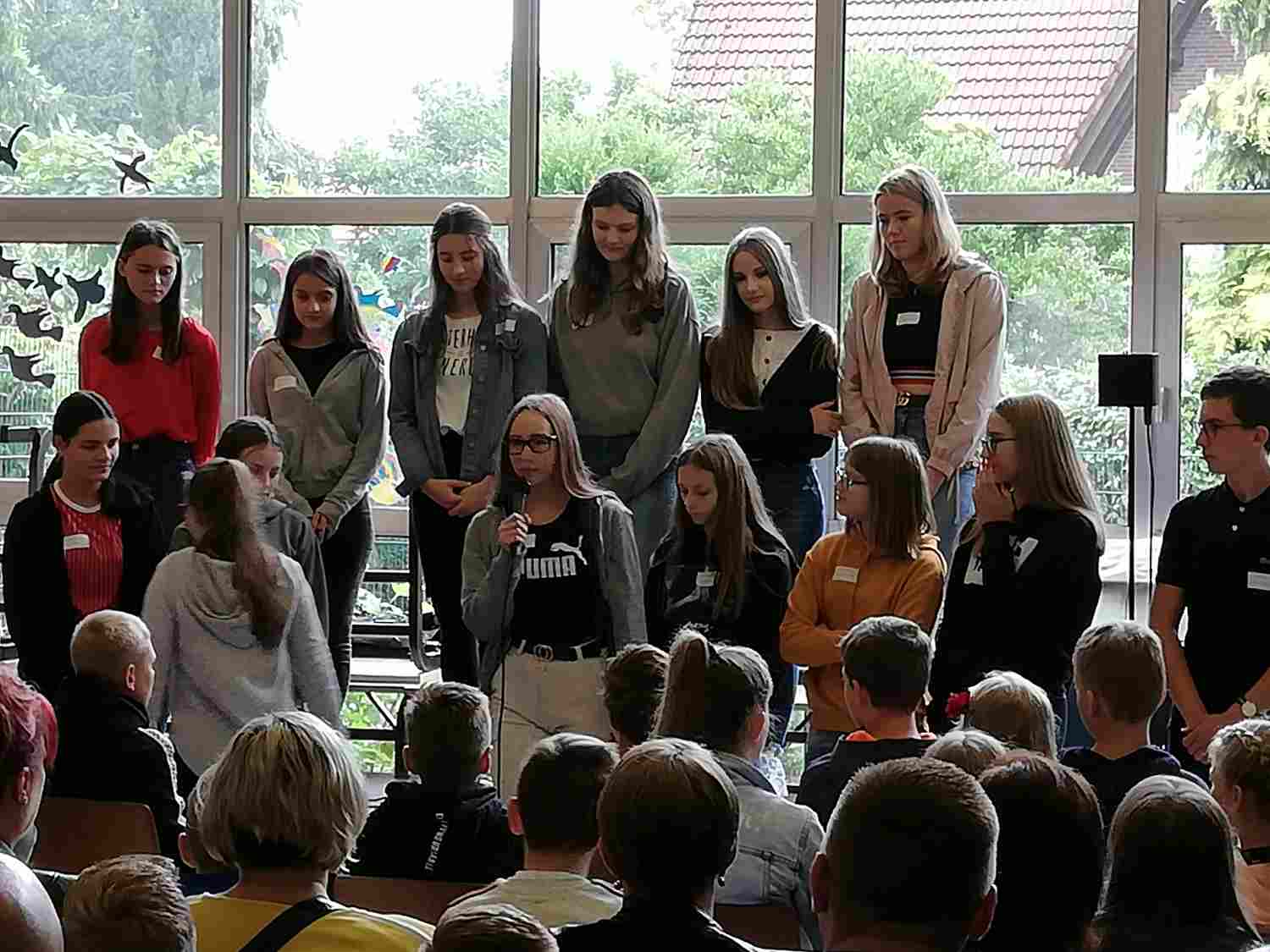 Aus dem Jahrgang 9 begrüßten die Klassenpaten die Neuen und stellten sich einzeln vor. Die Klassenpaten begleiten die Schülerinnen und Schüler der 5. Klassen in der ersten Zeit beim Kennenlernen, Zurechtfinden und auch bei Schwierigkeiten.