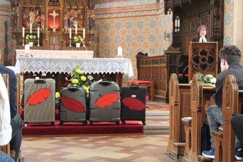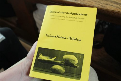 Wie ein roter Faden zog sich bereits in der kirchlichen Feier das Motto „Hakuna matata“, die Sorgen bleiben dir immer fern, durch die Verabschiedung. Die evangelische Pastorin Doris Scheidemann-Willenberg und der katholische Pfarrer Jörn Illenseer erinnerten hierbei an das Matthäus-Evangelium. „Sorgt euch nicht um euer Leben“, heiße es da, das bedeute, man solle auf Gott vertrauen und keine Angst vor der Zukunft haben, aber auch sich auf Neues einlassen und die eigenen Fähigkeiten entdecken. Wichtig sei es auf Beziehungen zu bauen und den Draht zu Gott nicht abreißen zu lassen. Schulleiterin Petra Brokamp interpretierte ‚Hakuna matata‘, den Spruch, der durch den Film ‚König der Löwen‘ bekannt wurde, als möglichen Grußformel, mit der man auf die Mitmenschen zugehen könne. Dabei bliebe der Wunsch nach dem Fernbleiben von Sorgen wohl in der Praxis eher eine Illusion. In Anlehnung an Goethe erinnerte Brokamp die Jugendlichen aber auch an die Möglichkeit aus den Steinen, die einem andere in den Weg legen, etwas Schönes zu bauen. Dies wäre wohl zielführender, als sich über Ärgernisse und Widrigkeiten zu beklagen. Aus der vergangenen Schulzeit könne man ebenfalls lernen, dass sich Beziehungen zu Eltern, Lehrkräften und Mitschülern lohnen, um mit Sorgen zurecht zu kommen und sie als Chance zu nutzen.