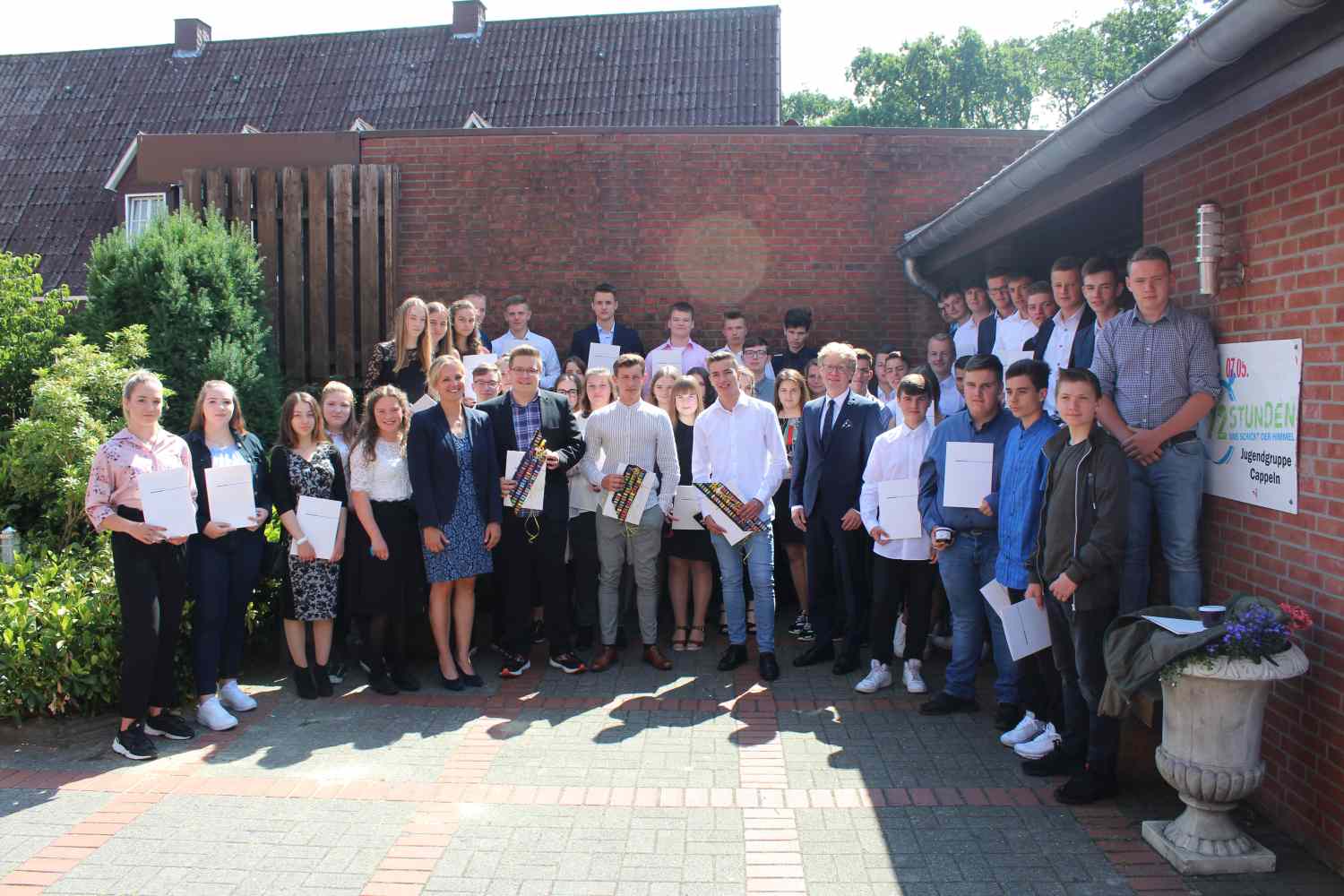 Foto: Alle Abschlussschülerinnen und Abschlussschüler mit den drei Besten Michael Wübben, Bernard Weever und Florian Kortschevski, der Schulleiterin Petra Brokamp und dem Bürgermeister Marcus Brinkmann