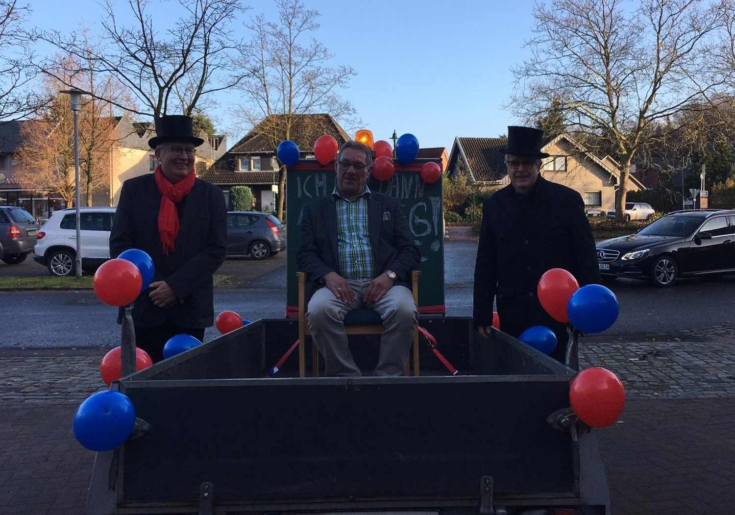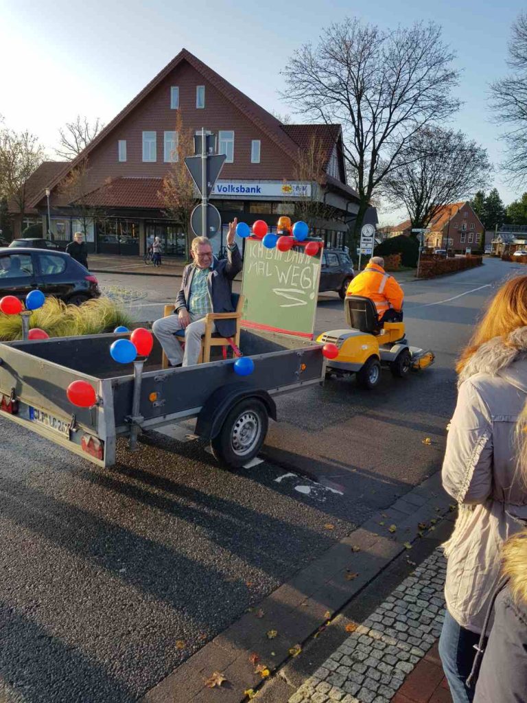 Der letzte Arbeitstag begann für Hermann ganz anders als gewohnt. Er wurde nämlich von den ehemaligen Schulleitern Manfred Plog und Günter Suhrenbrock zu seinem letzten Arbeitstag zu Hause abgeholt. Auf dem Marktplatz stieg er auf ein hausmeistertypisches Gefährt um, einem Rasenmähertrecker mit Anhänger, welches von Hausmeisterkollege Torsten Koopmeiners geschmückt und gefahren wurde. Die Schülerinnen und Schüler der Oberschule positionierten sich im Spalier rund um den Kreisel in der Ortsmitte und entlang des Adolph–Kolping-Weges, um ihrem Hausmeister zuzujubeln und bis zur Schule zu begleiten. Hierbei riefen die Schüler im Chor im wieder den Namen „Hermann“. Auf dem Schulhof sangen die Schülerinnen und Schüler ein Abschiedslied und Schülersprecherin Pia Vahle überreichte Arlinghaus einen Schlüssel in Großformat als Zeichen dafür, dass er immer willkommen ist. In einer Feierstunde mit Mitarbeitern sowie den Kollegien der beiden Schulen in Cappeln dankten Bürgermeister Marcus Brinkmann und Schulleiterin Petra Brokamp dem scheidenden Hausmeister für seine 17- jährige Tätigkeit, die er immer mit viel Herzblut, großem Engagement, einer fürsorglichen Nähe zu den Schülern und einer außerordentlichen Menschlichkeit sowie geduldigen und besonnen ausgeübt hat. Wir alle werden noch viel an Hermann denken, ihn vermissen und hoffen, dass er uns noch häufig besuchen kommt. Für seinen Ruhestand wünschen wir ihm alle erdenklich Gute, Gesundheit und viele schöne Momente!