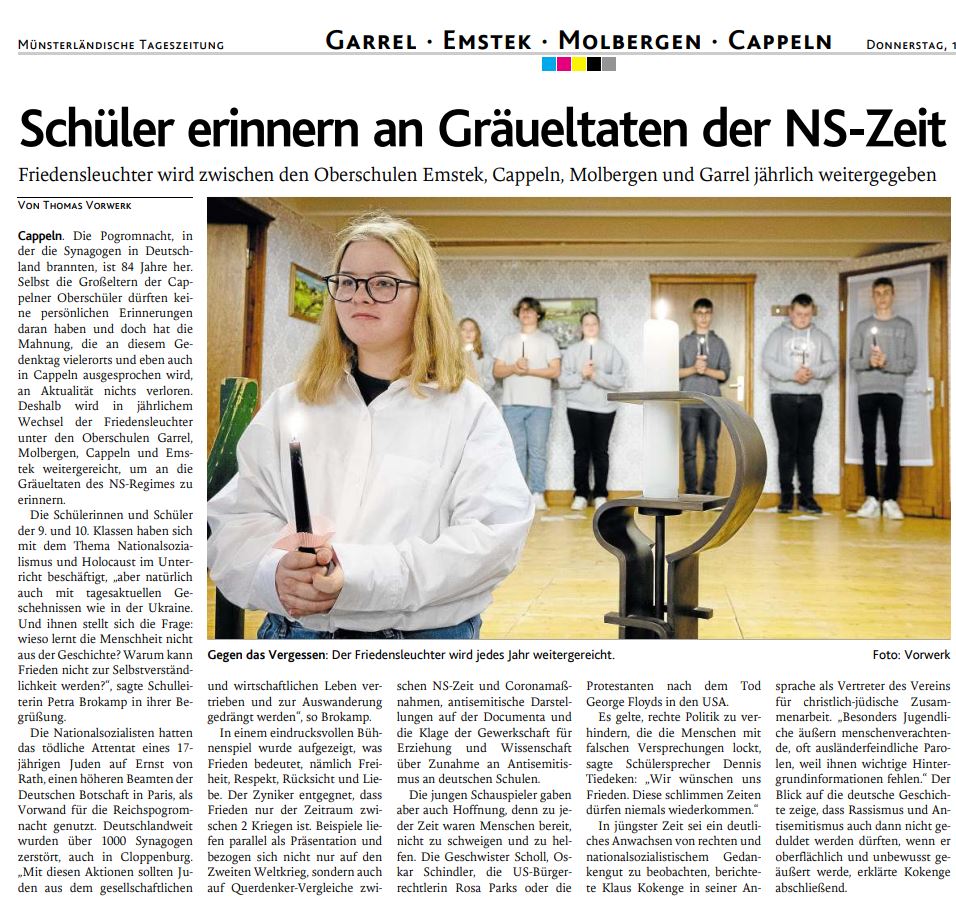 Am 09. November 2022 kam der Leuchter als Mahnmal gegen das Vergessen wieder nach Cappeln. Er erinnert an die Geschehnisse in der Reichspogromnacht des 9. November 1938 und an die Opfer des Holocaust. In den Vorjahren hat er in den drei Oberschulen in Molbergen, Garrel und Emstek gestanden.