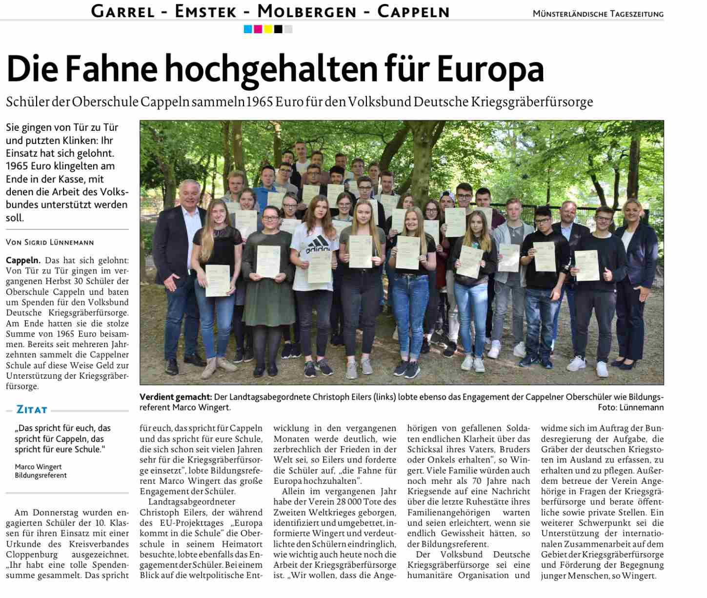 Auch in diesem Schuljahr engagierten sich zahlreiche Zehntklässler unserer Schule bei der Sammelaktion für den Volksbund deutscher Kriegsgräberfürsorge e.V. Die Sammlerinnen und Sammler gingen in einem zugewiesenen Gebiet der Gemeinde von Haus zu Haus und baten die Einwohner Cappelns um Spenden für die Kriegsgräberfürsorge. Der Volksbund benötigt die Gelder, um nach wie vor, gefallene Soldaten aus dem ersten und dem zweiten Weltkrieg zu bergen und sie in eine Kriegsgräberstätte zu überführen und gleichzeitig den Angehörigen darüber Auskunft zu geben. Weitere Aktionen des Volksbundes sind unter anderem auch die Jugendarbeit und die Pflege der Kriegsgräberstätten.