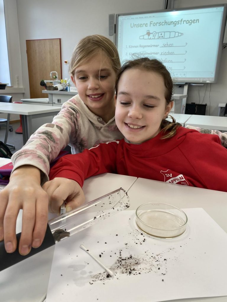 Die Bilder zeigen die Grundschüler während eines Versuchs Biologieunterricht über die Reaktion eines Regenwurms auf Dunkelheit und Helligkeit und des Versuch „Papierchromatographie“ im Chemieunterricht im Themenbereich Trennverfahren (2)