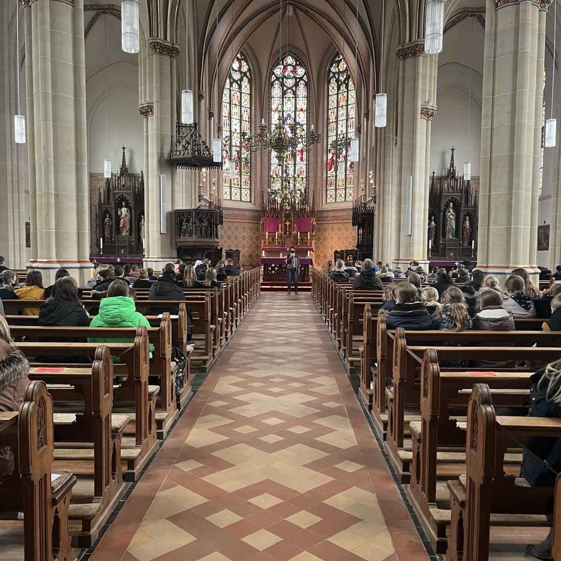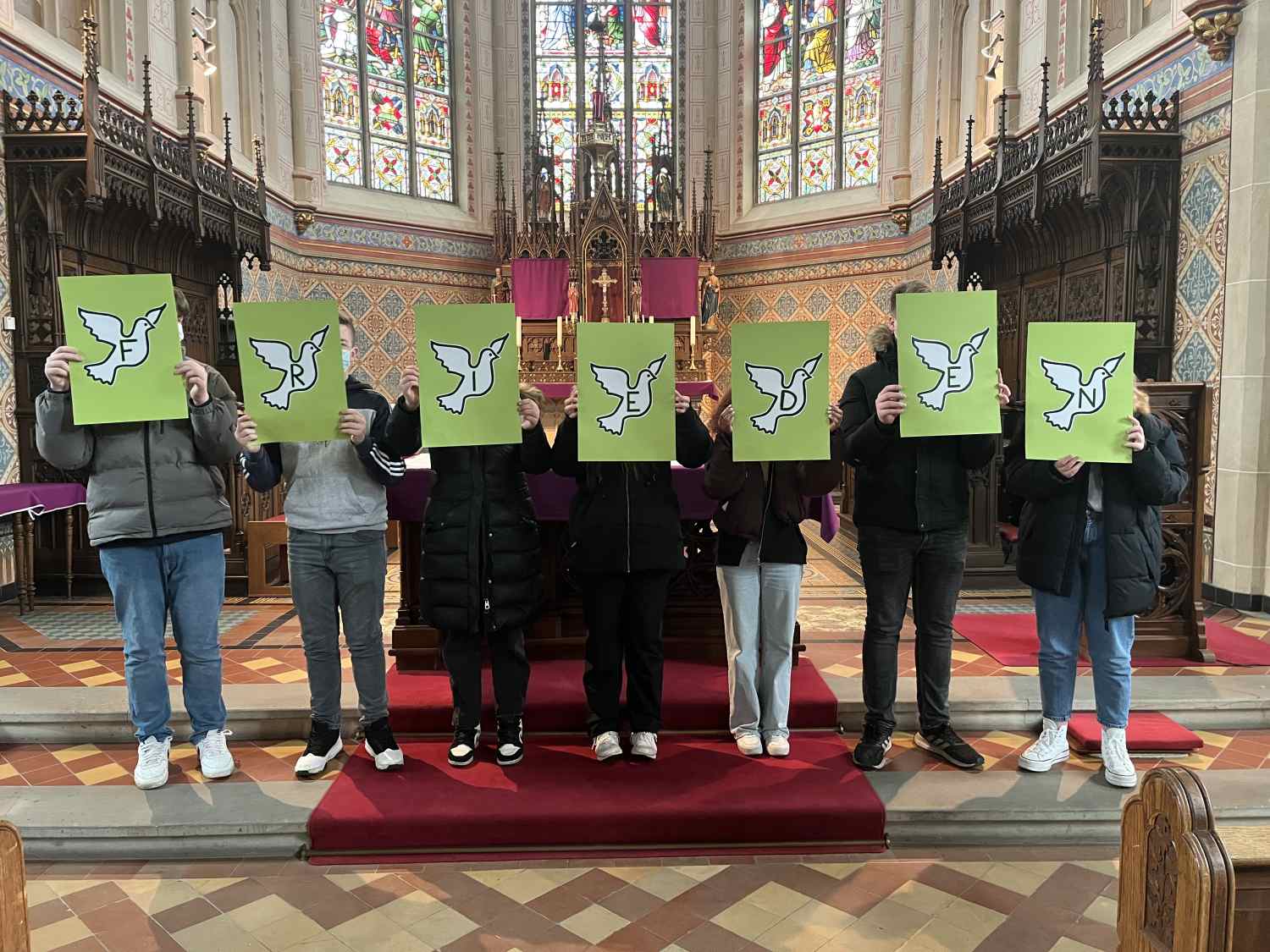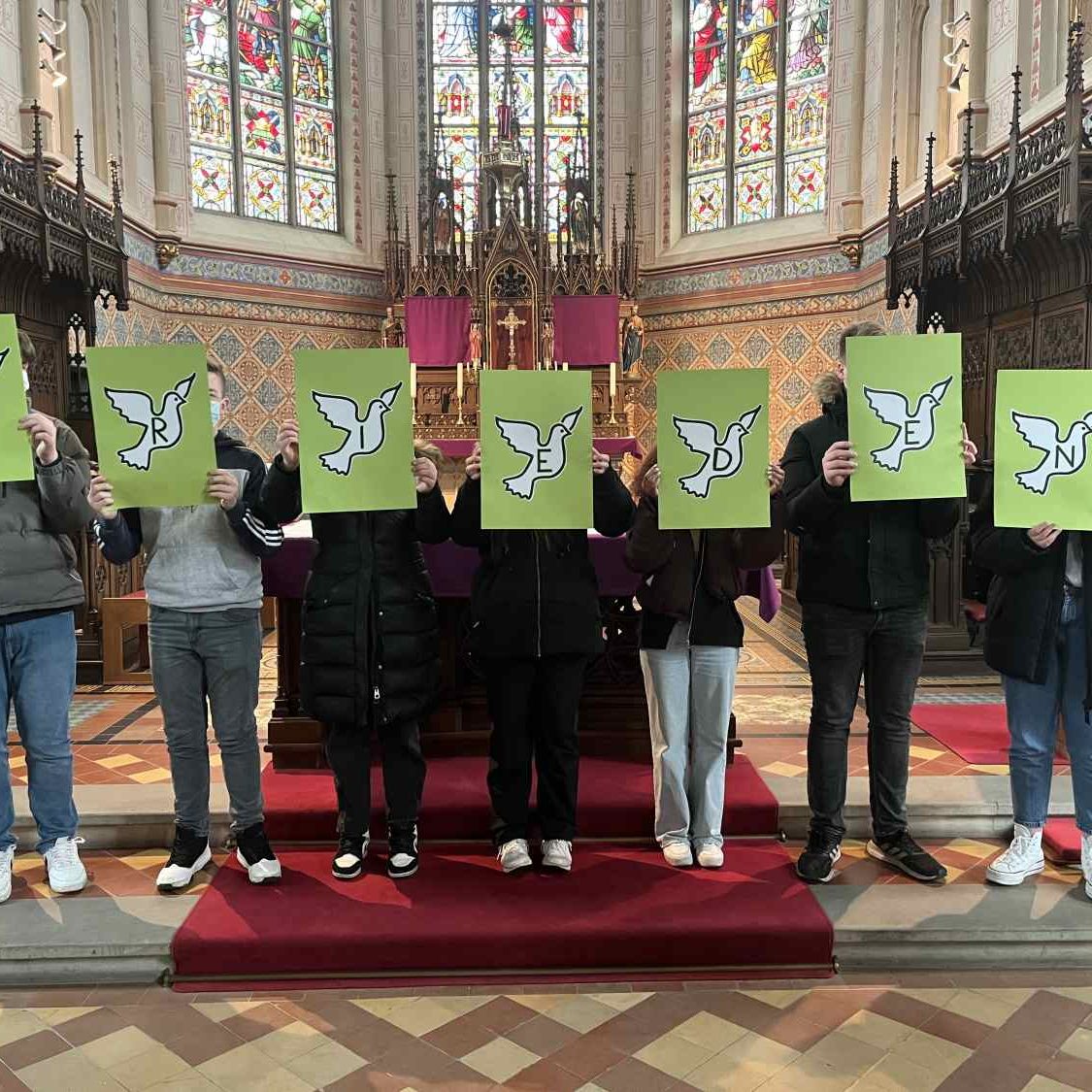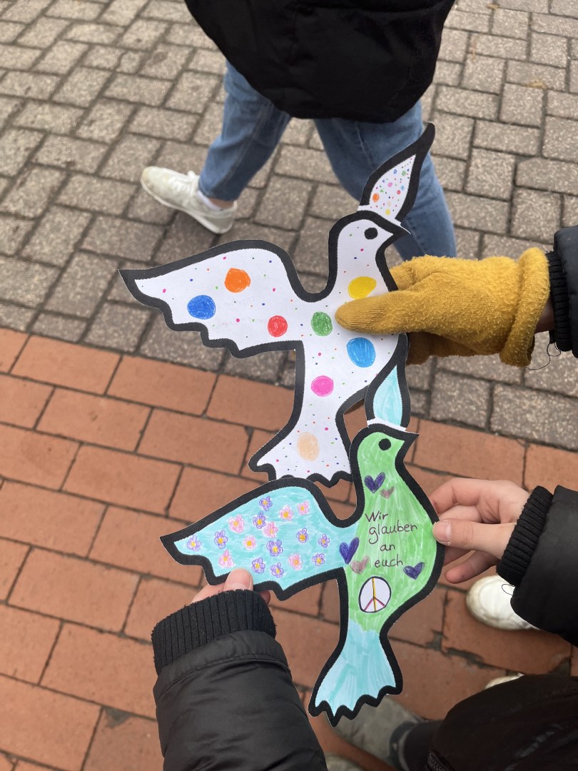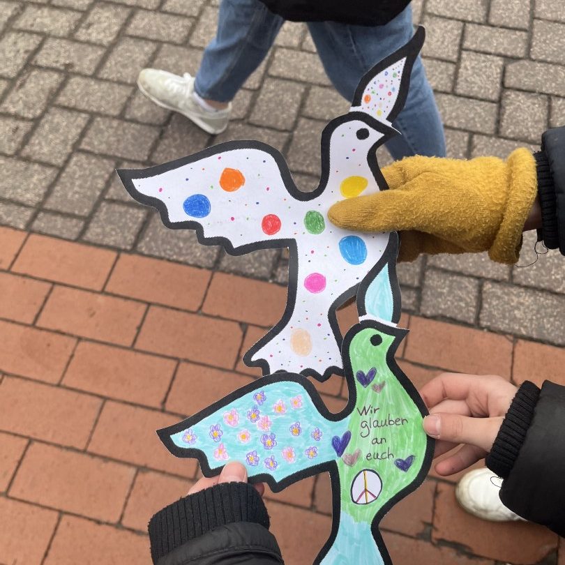 Die täglichen Nachrichten vom Krieg in der Ukraine machen die Schülerinnen und Schüler sowie die Lehrkräfte der OBS Cappeln sehr betroffen. Viele berichten davon, dass ihre Familien bereits geflüchtete Personen bei sich zu Hause aufgenommen haben und erzählen ihre Geschichten. Das veranlasste die Schulgemeinschaft eine Friedensaktion an der Schule durchzuführen, um an die Menschen, die in dem Krieg verwickelt sind, zu denken und ein Statement für den Frieden auch untereinander abzugeben. Dafür steht das Symbol der Friedenstaube, welche sich durch die ganze Aktion zieht. Sämtliche Türen erhielten neue Schilder in Form der Friedenstaube und die Fenster mit ihrem Bild geschmückt. Außerdem gestaltete jeder Schüler und jede Schülerin eine eigene Friedenstaube. Diese wurde zu einer kurzen Friedensandacht in die katholische Kirche getragen. Dort wurden alle Beteiligten durch das Lied „Wir ziehen in den Frieden“ von Udo Lindenberg eingeladen, sich auf das Thema „Frieden“ einzulassen. Anschließend wurde durch ein Akrostichon mit dem Wort „Frieden“ zum Nachdenken angeregt. Den Schluss der Andacht bildete ein ökumenisches Friedensgebet, welches von allen gemeinsam gelesen wurde. Zurück auf dem Schulhof angekommen, puzzelten die Klassensprecher*Innen, umstellt von allen anderen mit ihren Friedenstauben, ein großes Bild einer Friedenstaube zusammen, um so ein Zeichen für ein friedliches Miteinander zu setzen.