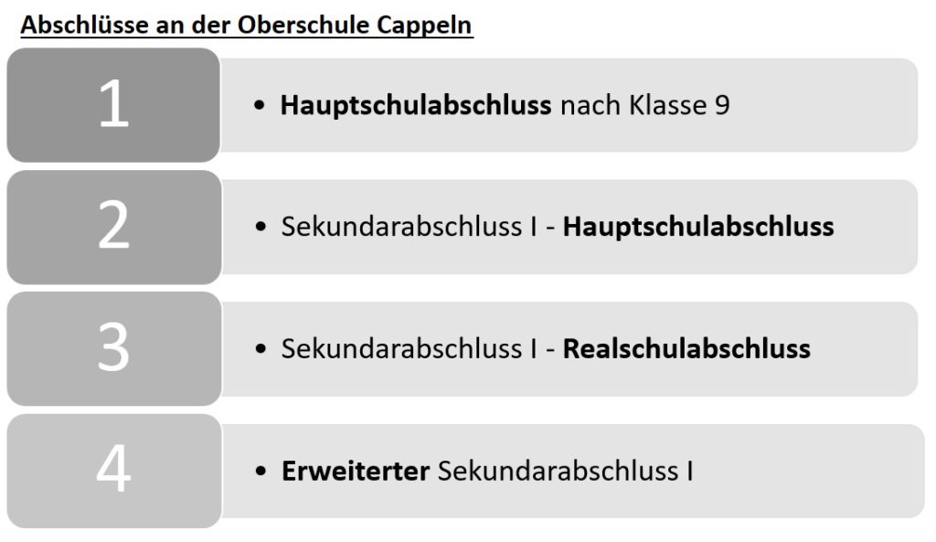 Aufgrund eines breiten Bildungsangebotes können alle Abschlüsse des Sekundarbereiches I erworben werden. Der erweiterte Realschulabschluss berechtigt zum Übergang in die gymnasiale Oberstufe. In den letzten Jahren haben viele Schülerinnen und Schüler unserer Schule diesen Abschluss erreicht.