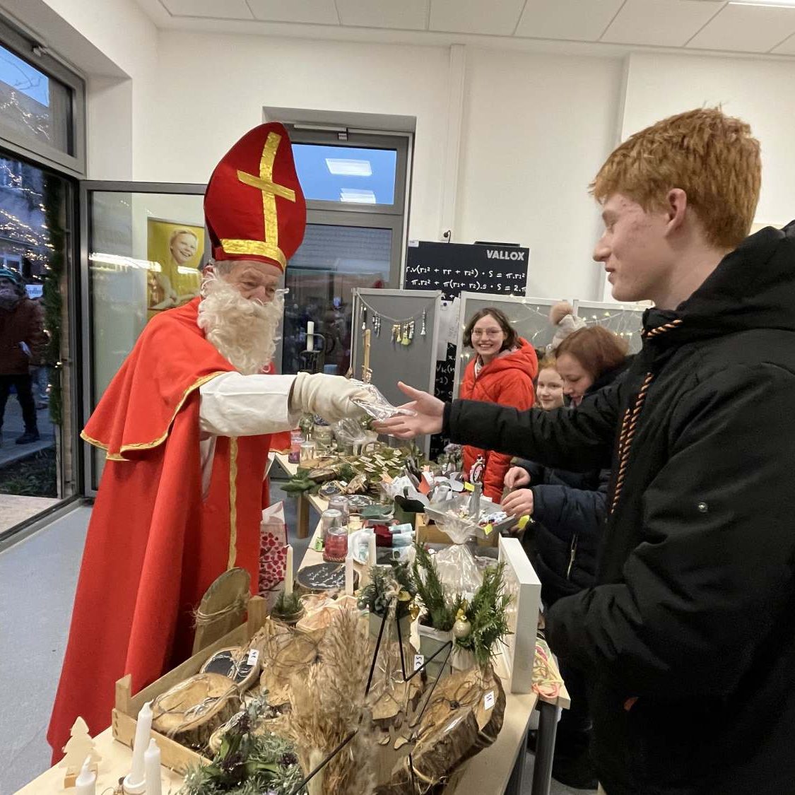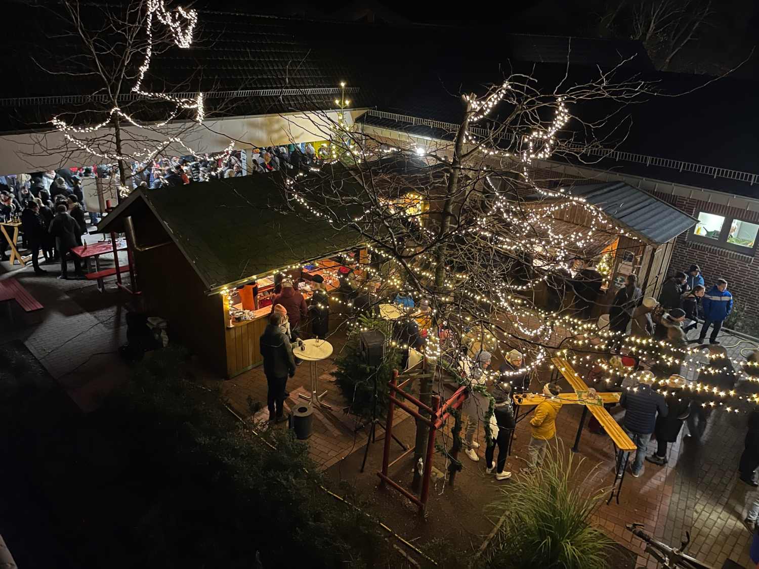 Erstmals fand am 3. Adventswochenende der Cappelner Weihnachtsmarkt auf dem unserem festlich geschmückten Schulgelände statt. Die am Weihnachtsmarkt beteiligten Cappelner Vereine ziehen eine äußerst positive Bilanz. Im Vorfeld haben zahlreiche Schülerinnen und Schüler tatkräftig beim Schmücken und Aufbauen der Buden geholfen. Die intensiven Vorbereitungen wurden mit einem hohen Besucherandrang belohnt. Das Ambiente bestach durch eine Vielzahl von Lichtern und Kerzenschein. Die weihnachtlich geschmückten Holzbuden luden zum Verweilen ein und boten den Besuchern ein vielfältiges Angebot. Bei Glühwein, Punsch, Punkebrot, Flammlachs, Schmalzkuchen und vieles mehr trafen sich die zahlreichen großen und kleinen Besucher. Viele Eltern zeigten sich dankbar für das kunterbunte Programm für die Kinder. So schmückten die Kinder den Weihnachtsbaum auf dem Platz und der Nikolaus begrüßte die Kinder und brachte Mehlbolzen mit. Ein Besuch in der Spiel- und Malecke, beim kleinen Karussell und in der Schminkstation waren weitere Highlights für die Kinder. Das Platzkonzert des Musikvereins mit Weihnachtsliedern sorgte bei allen Gästen für vorweihnachtliche Stimmung. Viele Eltern von Oberschülern sowie viele andere Besucher nutzten die Gelegenheit, die von den Schülerinnen und Schülern selbst erstellten Deko- und Geschenkideen zu erwerben, dessen Erlös gespendet wird. An den beiden Tagen halfen über 70 Schülerinnen und Schüler in verschiedenen Schichten am Verkaufsstand oder beid er Kinderbelustigung. Die festlich geschmückte Mensa bescherte allen Kaffeedurstigen und Kuchenhungrigen eine warme Atmosphäre. Der Höhepunkt des Weihnachtsmarktes bildete die große Tombola. Über den Hauptpreis, eine Reise nach Dresden freute sich unsere Zehntklässlerin Vera Niemöller aus Cappeln. Marktmeister Benno Sieverding zeigte sich sehr zufrieden mit der Umsetzung des diesjährigen Weihnachtsmarktes und der hohen Besucherzahl. Alle ehrenamtlichen Helfer lobten die optimalen Bedingungen und freuten sich über das Lob der Cappelner Bürger und Bürgerinnen.